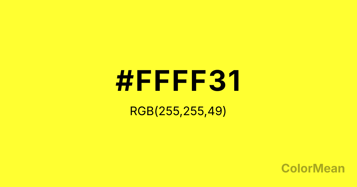 Daffodil (#FFFF31) RGB value is (255, 255, 49). The hex color red value is 255, green is 255, and blue is 49. Its HSL format shows a hue of 60°, saturation of 100 percent, and lightness of 60 percent. The CMYK process values are 0 percent, 0 percent, 81 percent, 0 percent.